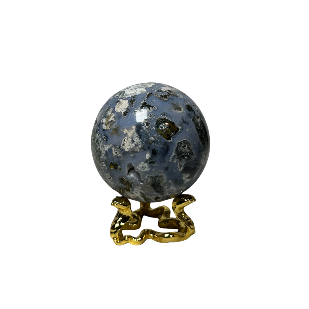 This captivating Blue Moss Agate Sphere is a truly one-of-a-kind piece—measuring approximately 5 inches and carved from genuine Blue Moss Agate. With its swirling patterns of deep blue and earthy inclusions, this sphere feels like holding a piece of the forest sky in your hands.
