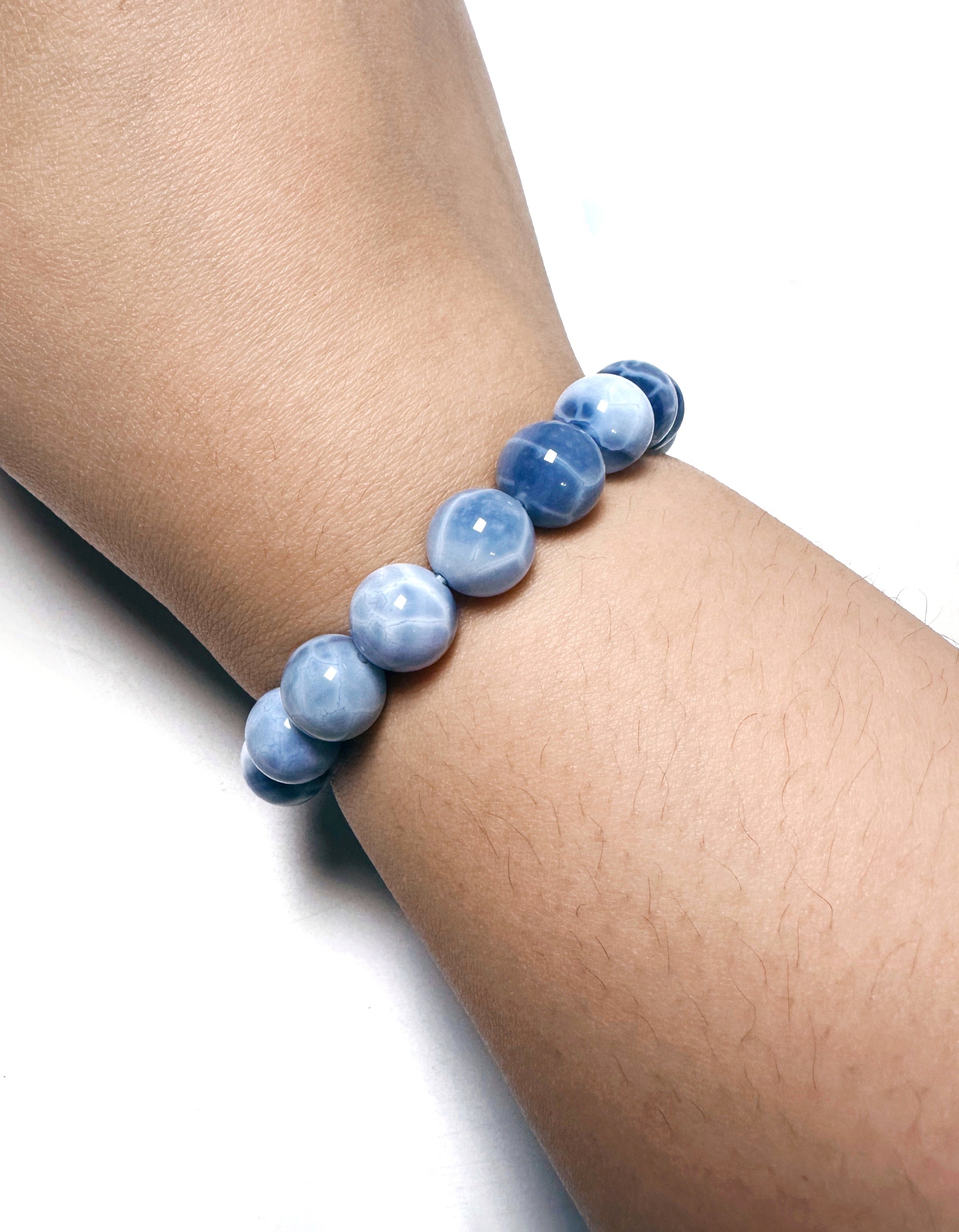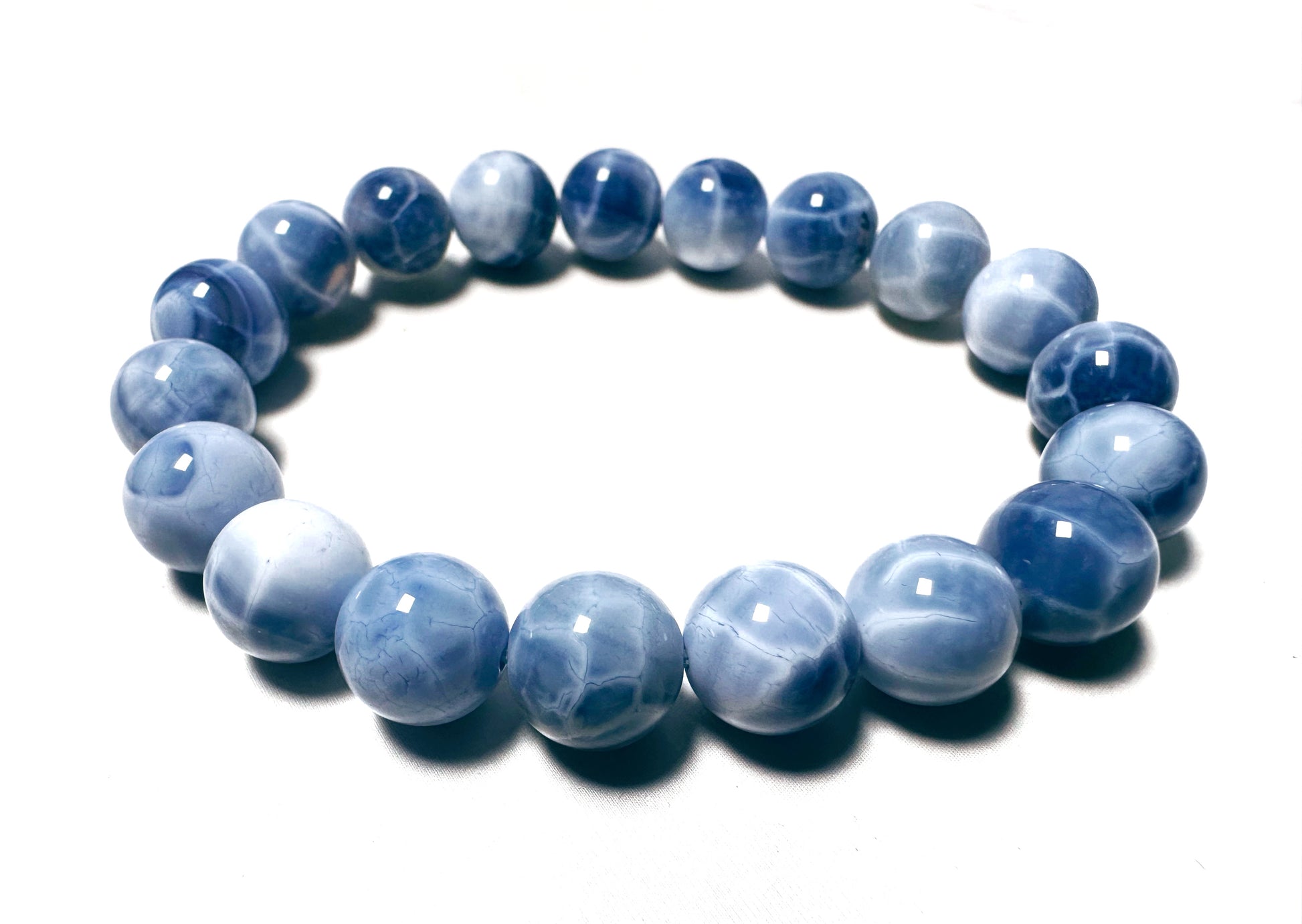 This Blue Lace Agate Beaded Bracelet features genuine 10mm beads in dreamy shades of soft blue with delicate banding. Known for its soothing and nurturing energy, Blue Lace Agate is a stone of calm communication, inner peace, and emotional clarity.