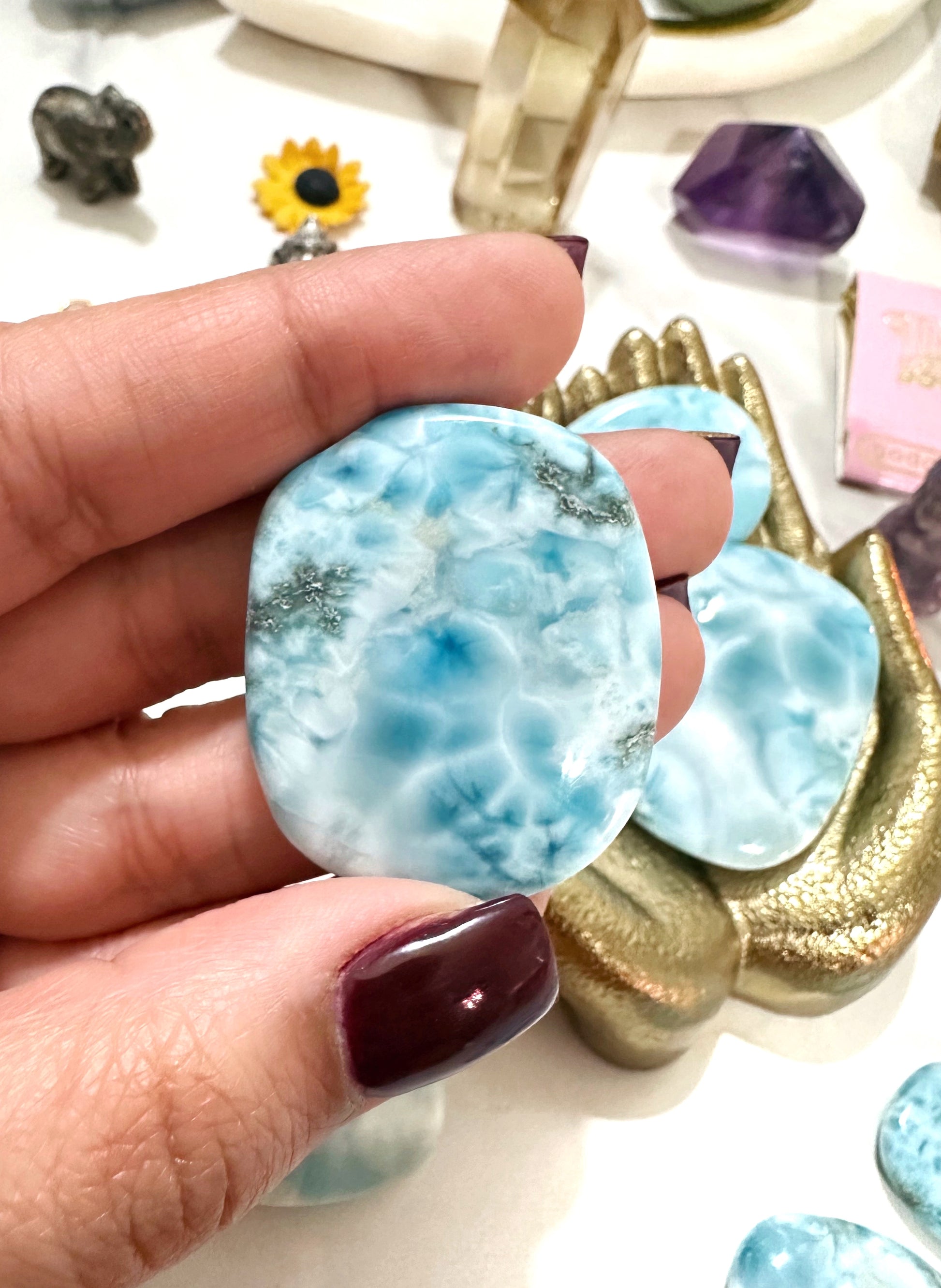 We’re beyond excited to introduce our Grade AA Top Quality Larimar Palm Stones to the Luni Magic Collection! Sourced ethically from the Dominican Republic 🇩🇴, these stones are truly special to us—especially as a Dominican American, finding an ethical supplier was a heartfelt priority. Each palm stone is one-of-a-kind, ready to bring powerful healing energy into your life.