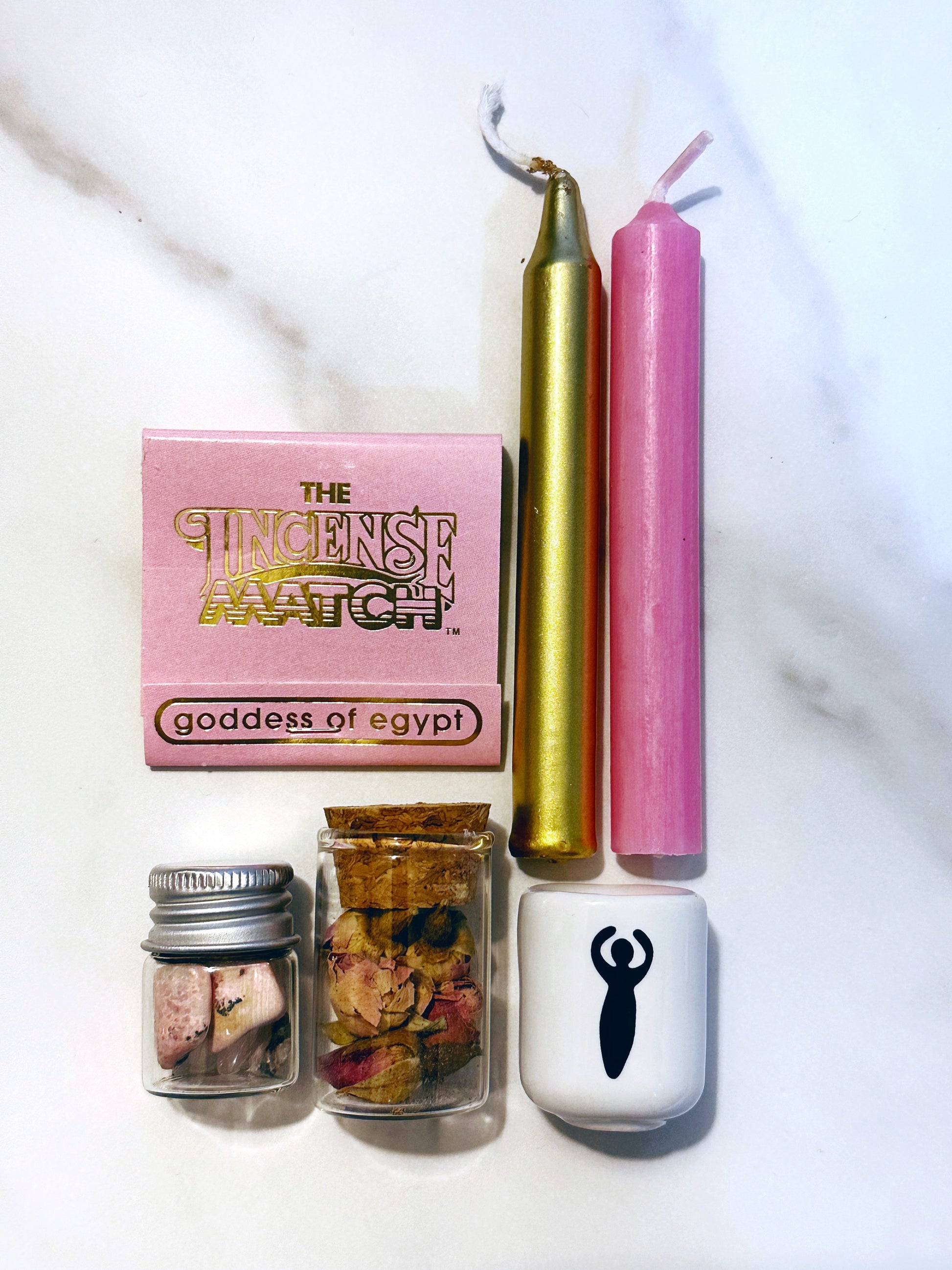 Anoint your candles with your favorite love oil and sprinkle them with crushed rose buds to activate your intention. Burn the incense matches to set the mood and invite goddess energy into your space. Place the crystals around your candle holder to amplify your ritual with healing vibrations.